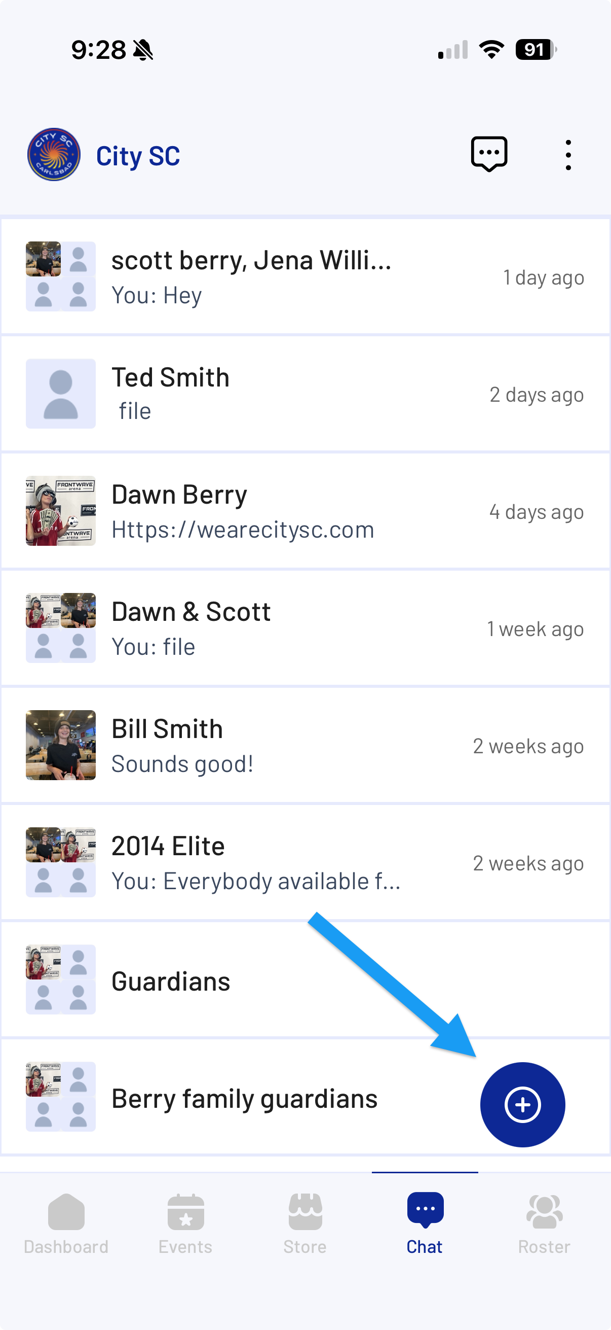 - Tap the + (plus) icon in the lower right corner of the Chat screen.